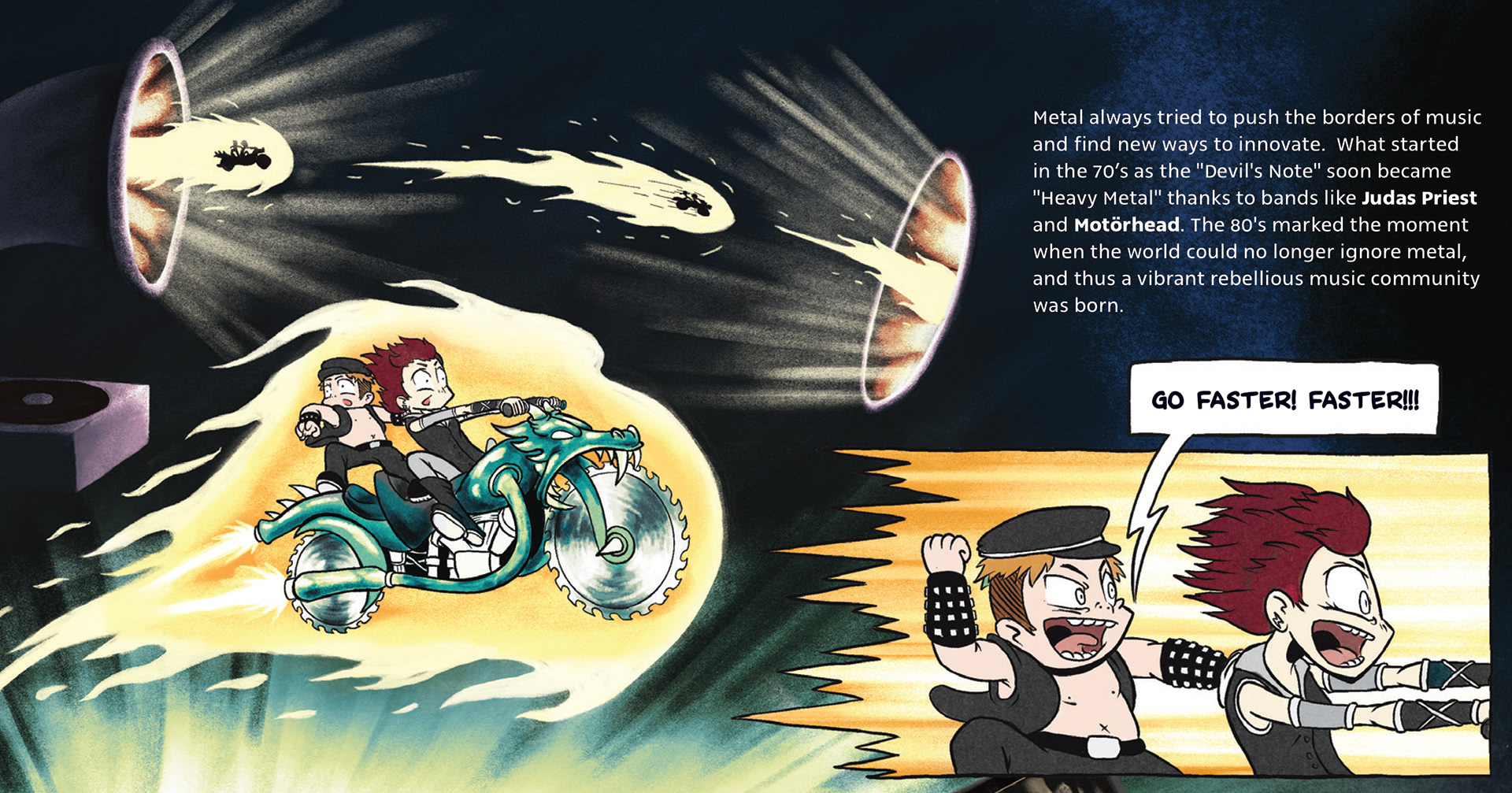 Join the afternoon adventure of two siblings who stumble upon their mother's old record collection and get transported into the huge, diverse and often misunderstood world of Metal music. A vinyl-sized book mixing full-spread illustrations with comic storytelling, "Metal For Everyone" follows the evolution of the Metal genres and communities around the globe and throughout history.